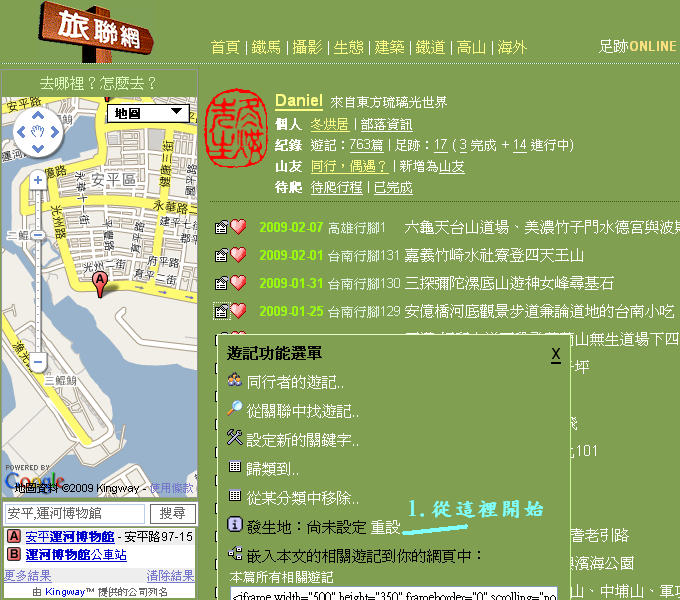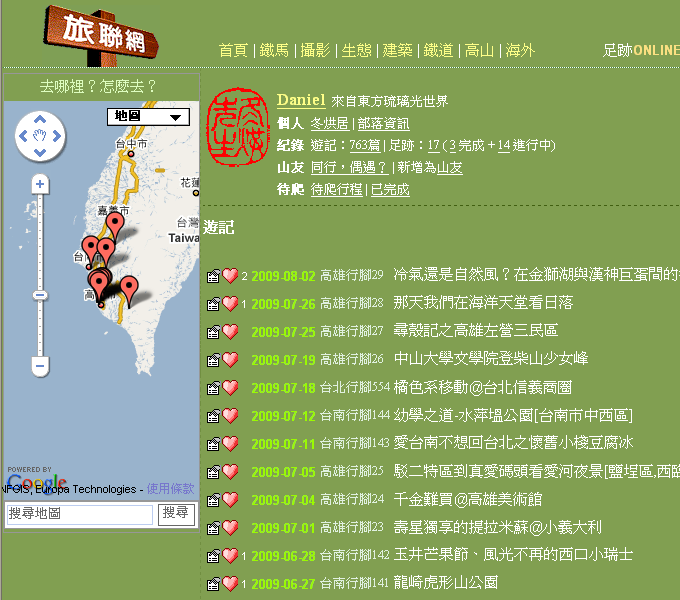 為遊記設定座標很簡單,而且可以在地圖上顯示出自己最近去過的地方一覽,從以下的地圖顯示可知冬烘先生最近都在高雄、台南附近趴趴走。