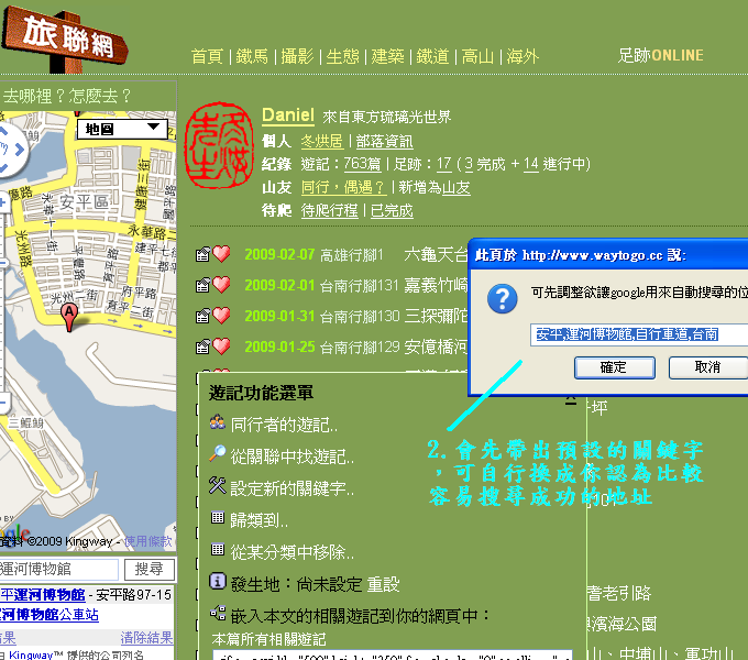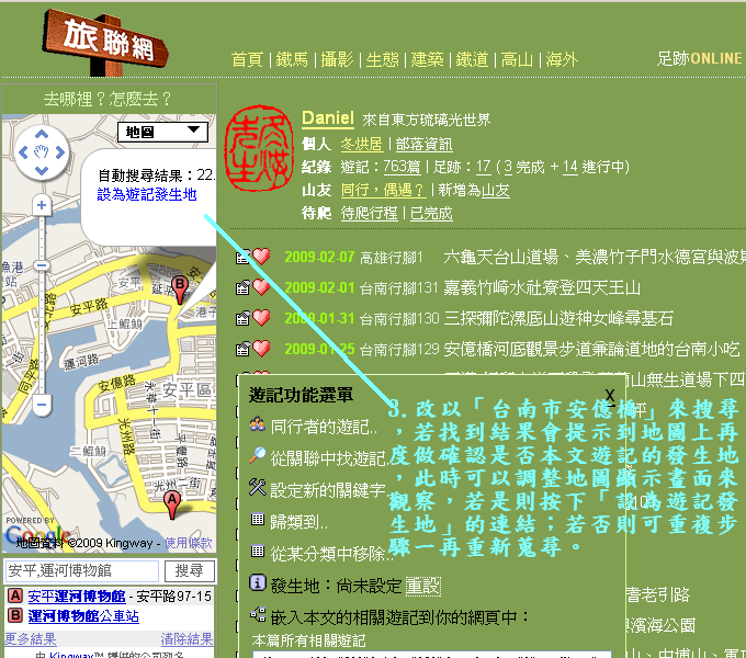 4.你可以為自己的遊記定位,也可以幫別人的遊記定位,只要你事先有登入旅聯網的話,每定位一篇遊記就會「得到一分」,並且有機會成為旅聯網的定位達人。