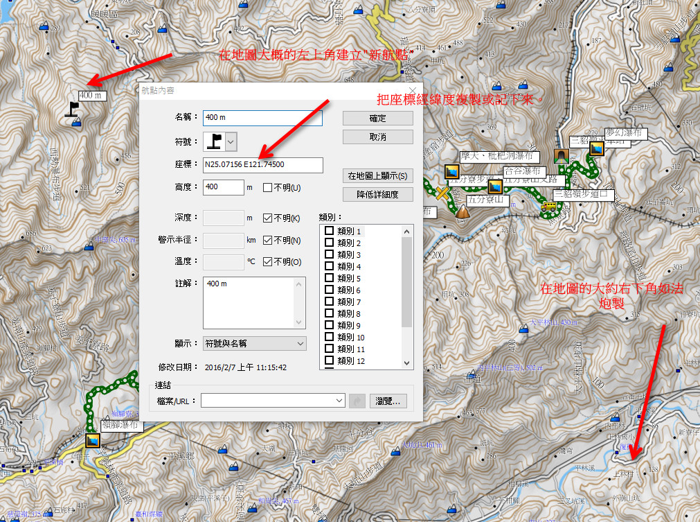 4.輸入第一個欄位的地圖名稱,第二個欄位位址留空,將邊界座標輸入到第三個欄位-邊界座標。地形圖選經建三版。分類依地區分類,如選大台北郊山。來源遊記輸入遊記代號,如 71292。若此遊記已有附帶 gpx 檔,便會下方出現提示,如 71292.gpx,照樣手動輸入 71292.gpx 即可。其他非必要欄位,可自行斟酌提供。