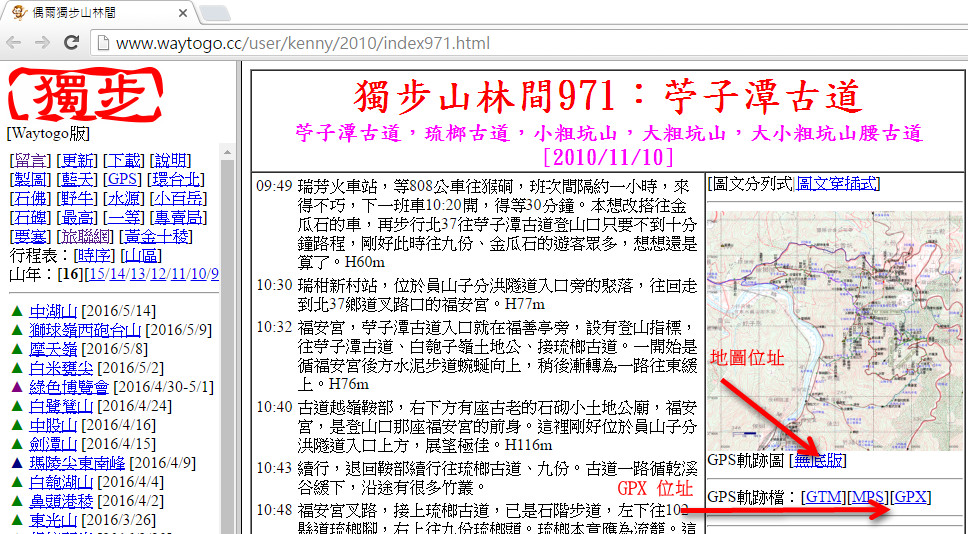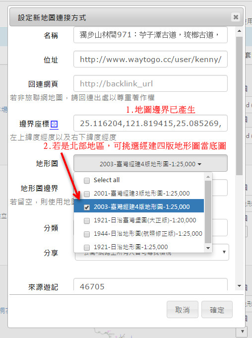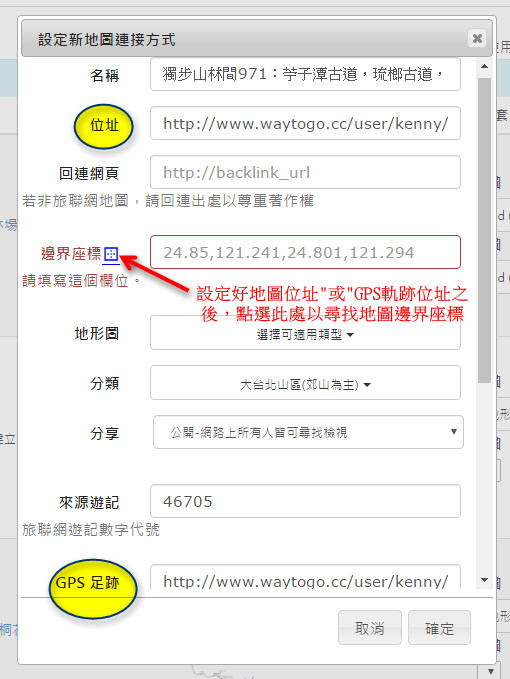 2.在旅聯網搜尋到蕭郎的「苧子潭古道,琉榔古道,小粗坑山,大粗坑山,大小粗坑山腰古道」遊記。開啟該篇遊記,依序複製軌跡圖無底版的網址以及GPX位址到「設定新地圖連接方式對話窗」的相對欄位。