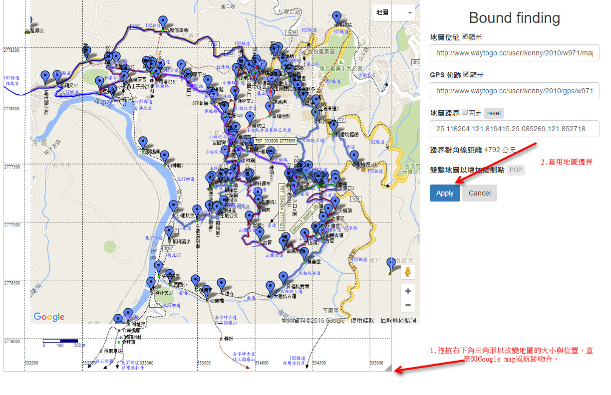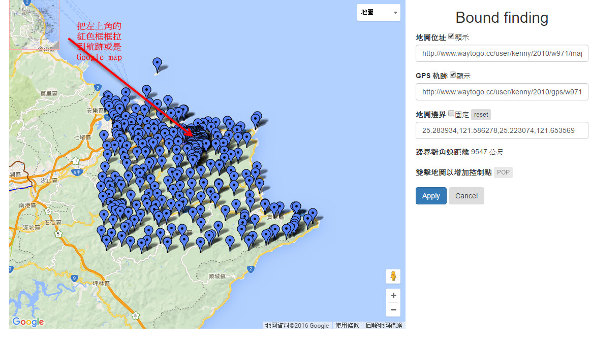 3.新地圖影像必須知道地圖邊界(若只有航跡則可不用設邊界)。點選設定邊界座標旁的小圖示,開啟「尋找邊界」視窗。依照以下的說明,用拖拉方式找出吻合的地圖邊界。