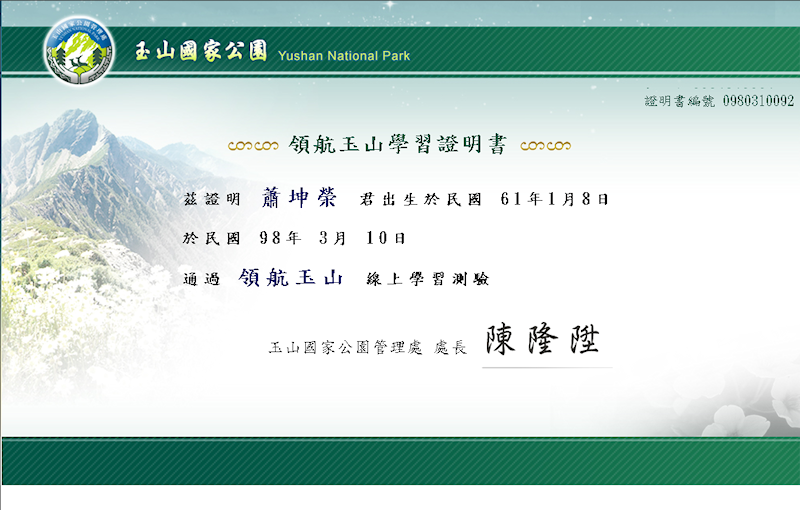 登玉山時在塔塔加管理站要拿出證書要給管理員看,或是告知證書號碼。
