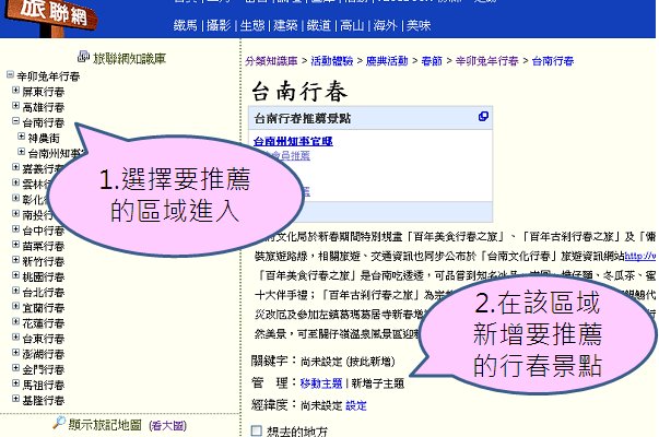2.進一步選擇推薦景點所在的區域,並在其下「新增一個子主題」,如在台南新春之下,新增神農街: