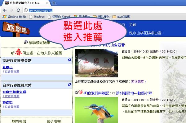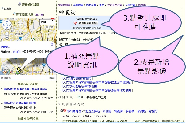 4.在新增的景點如神農街中,按下「我推薦到神農街」的按鈕,即可完成您的推薦。並可看到有多少人也推薦這個地點。若回到旅聯網首頁後,也會看到左邊邊攔的「台南行春」推薦景點中依照推薦數列出景點。